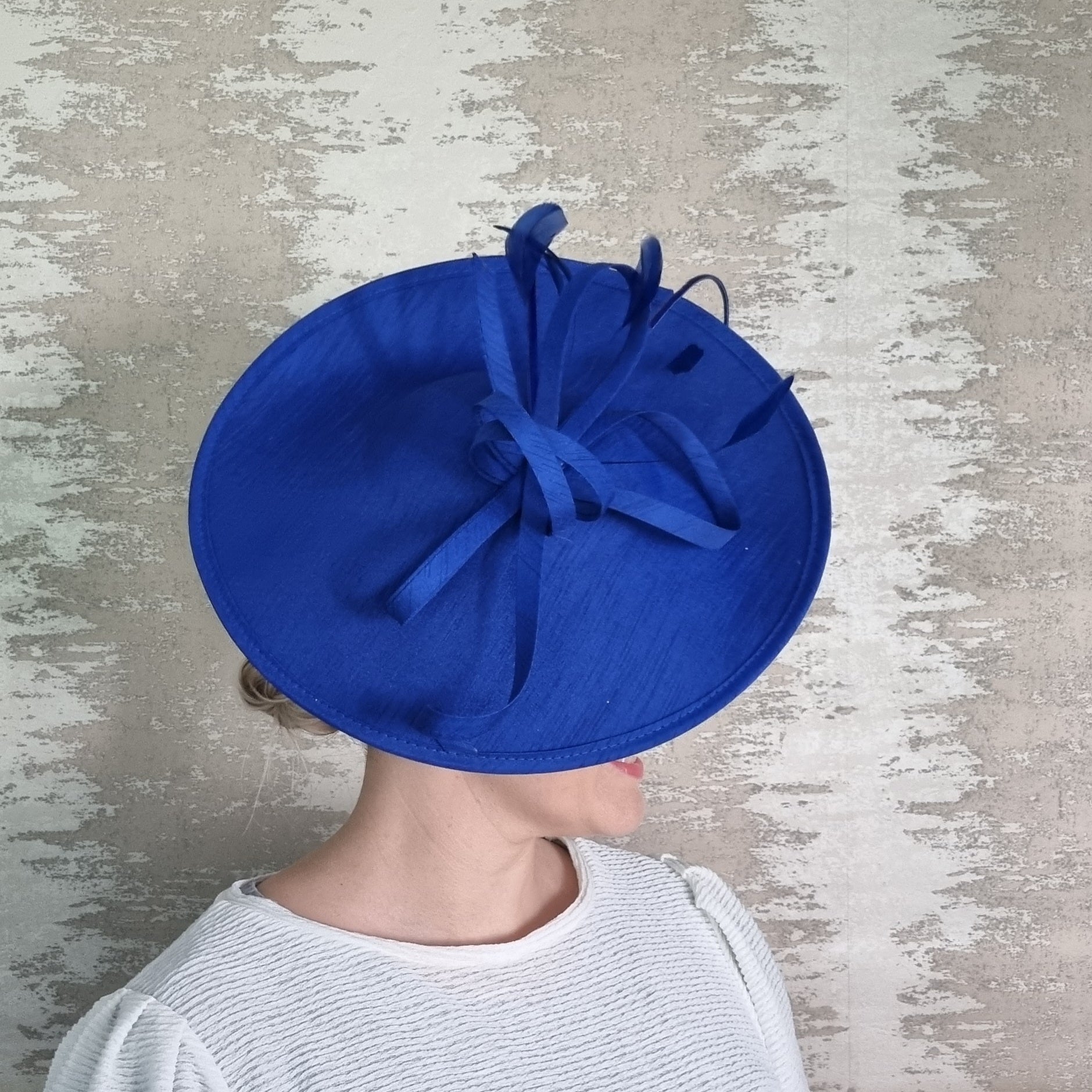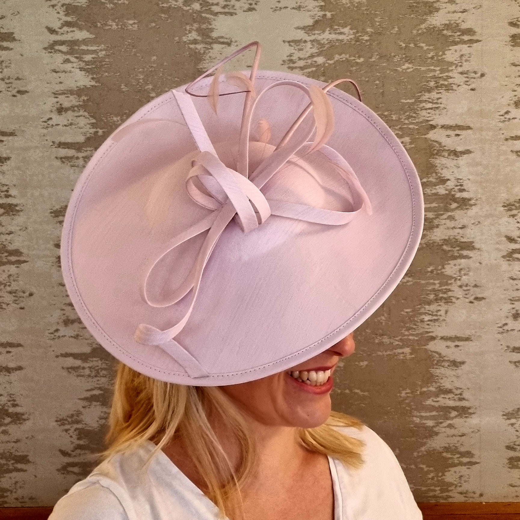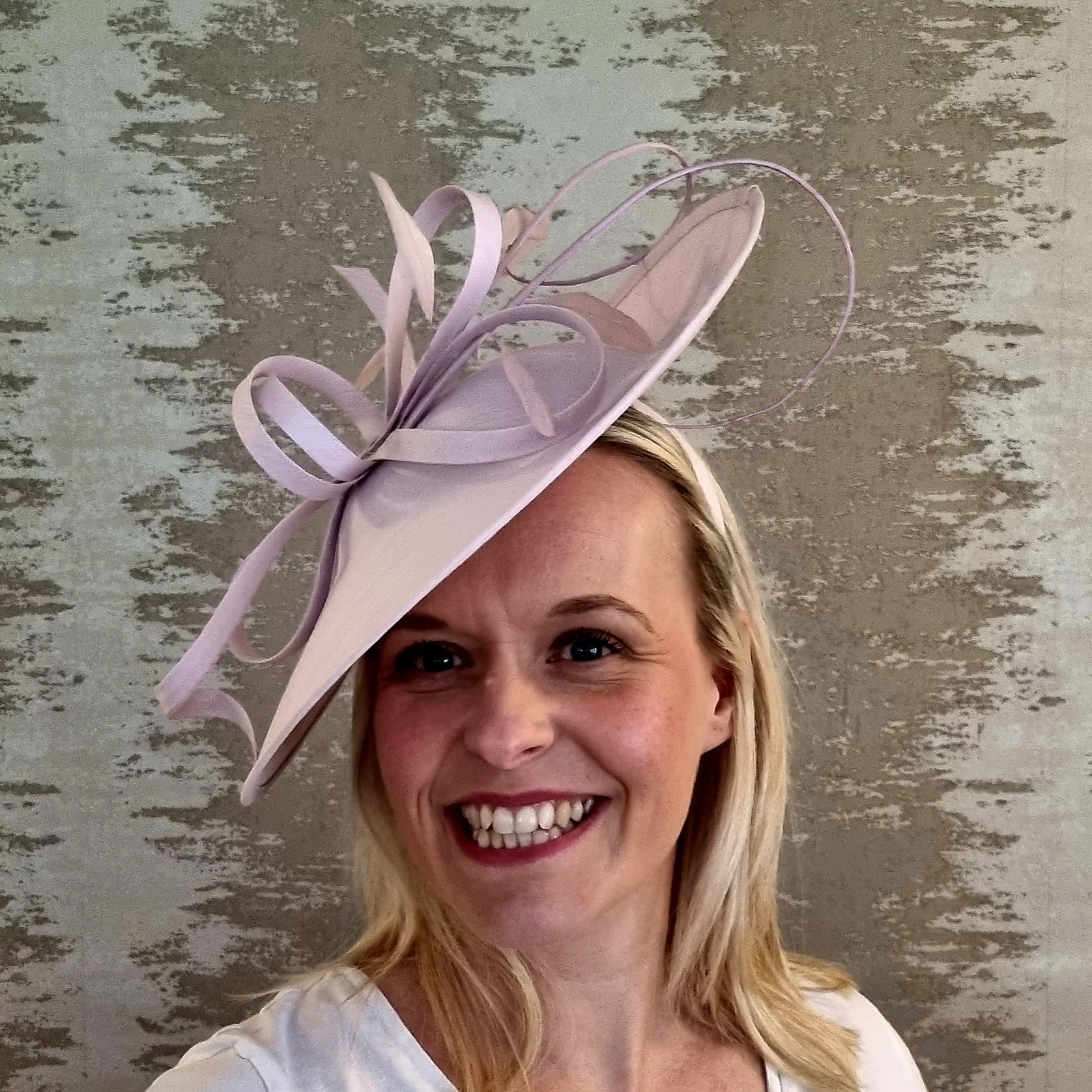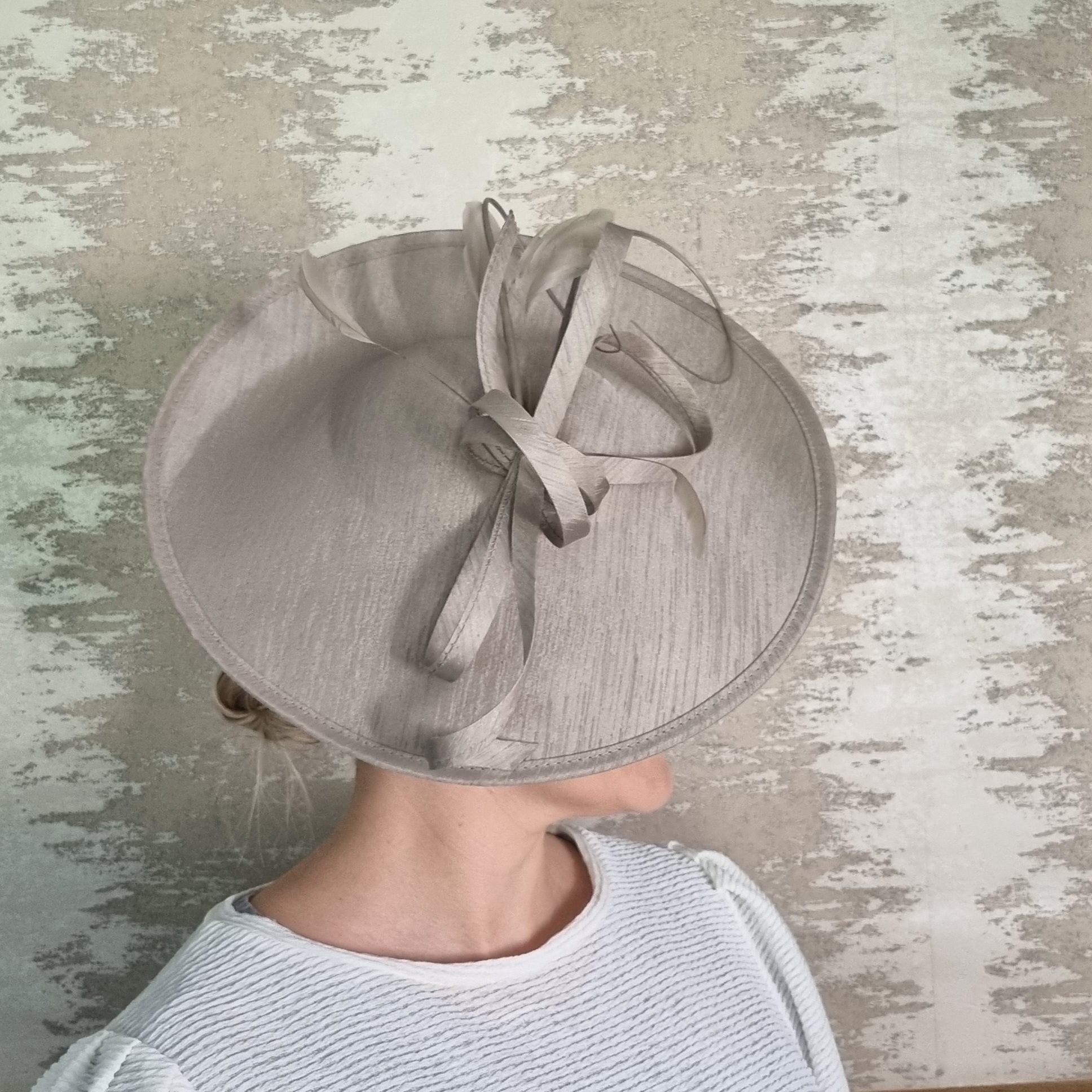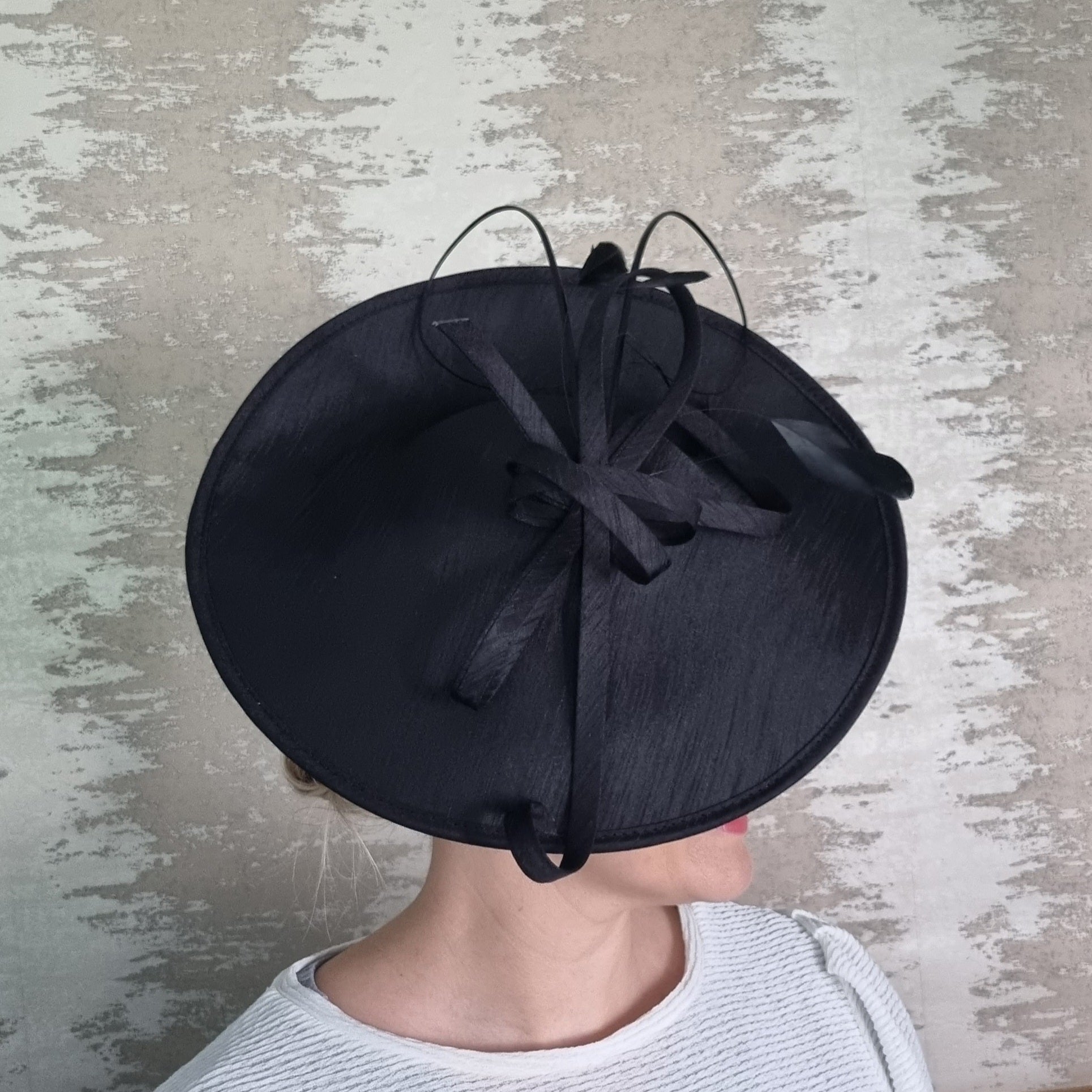 A hatinator that sits elegantly on the side of your head. Twirls and bows add some detail and height, while keeping it simple and elegant. Sits on a matching satin headband.
