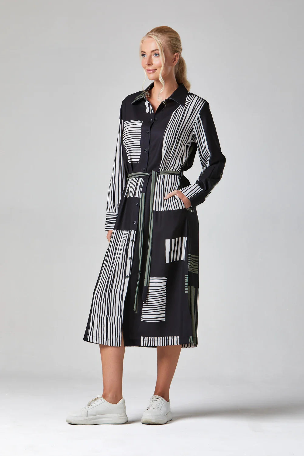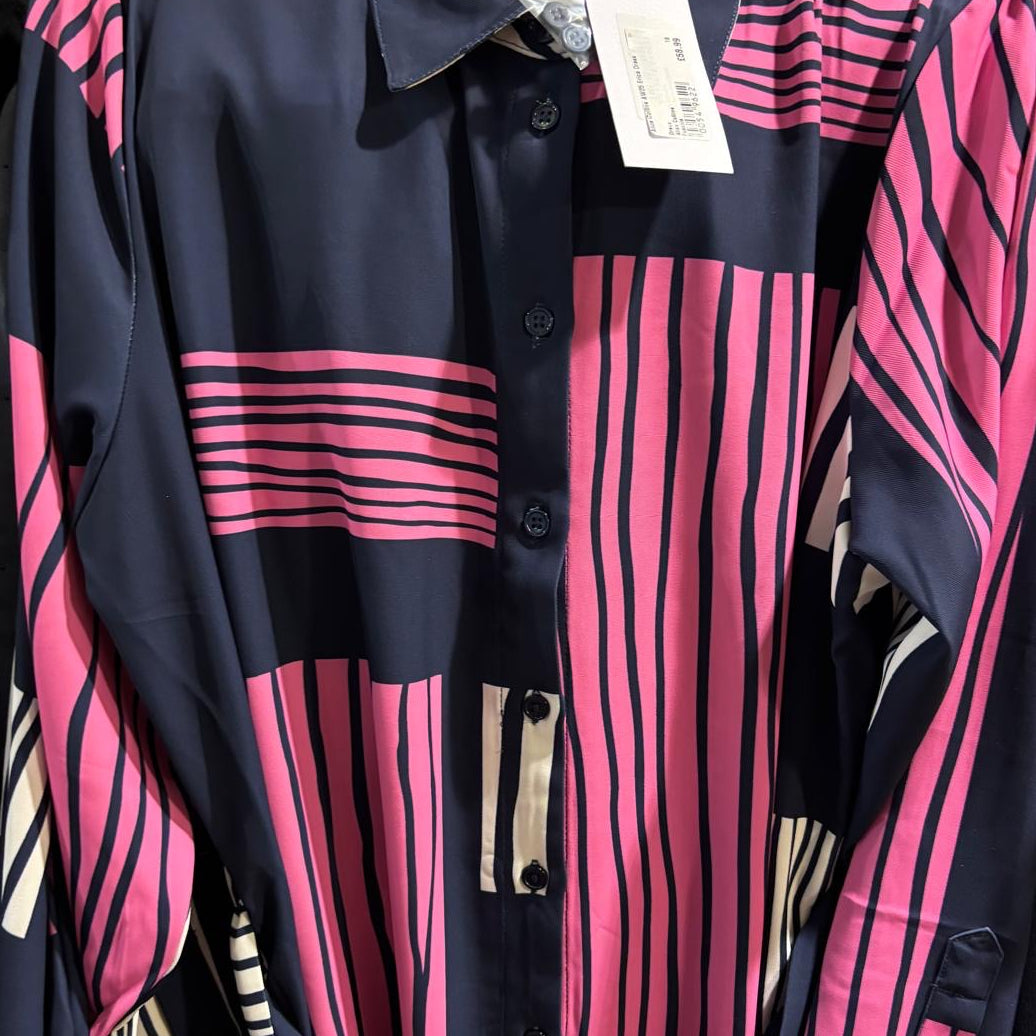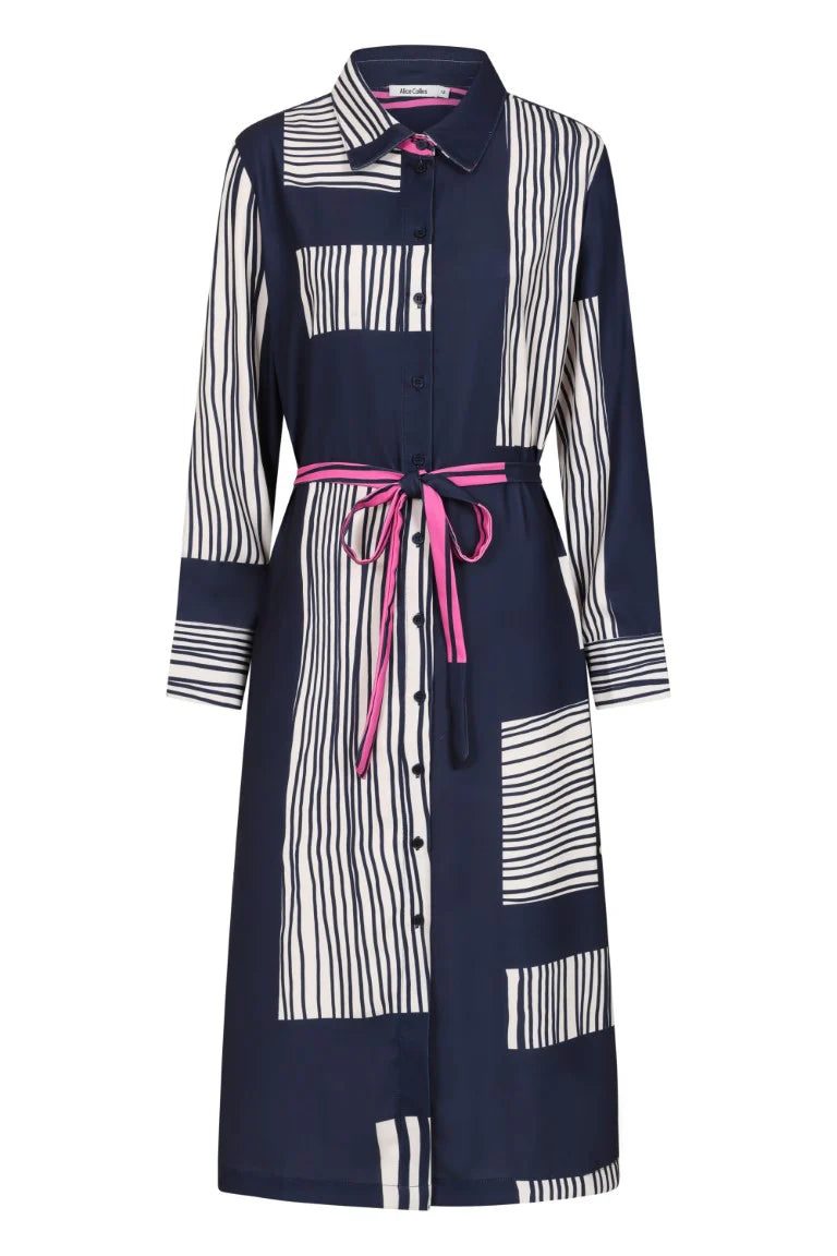 A contemporary shirt dress featuring a bold mix of vertical and horizontal stripes, full button-down front, and a matching tie belt for a flattering fit. Available in two striking colourways – black with olive accents or navy with pink highlights – this versatile midi is perfect for both casual and elevated looks.