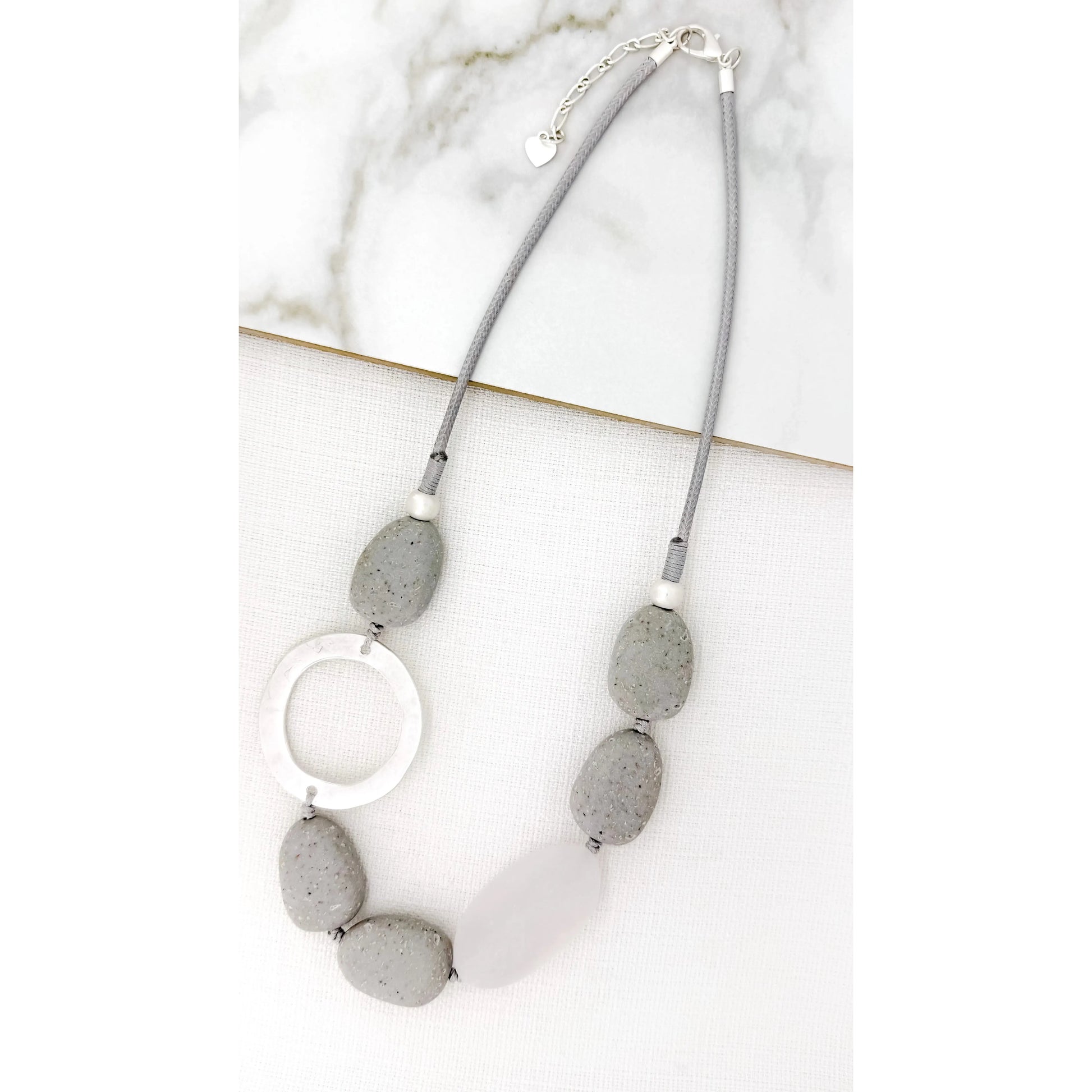 Grey cord necklace with grey beads and silver circle detail by Envy Jewellery.