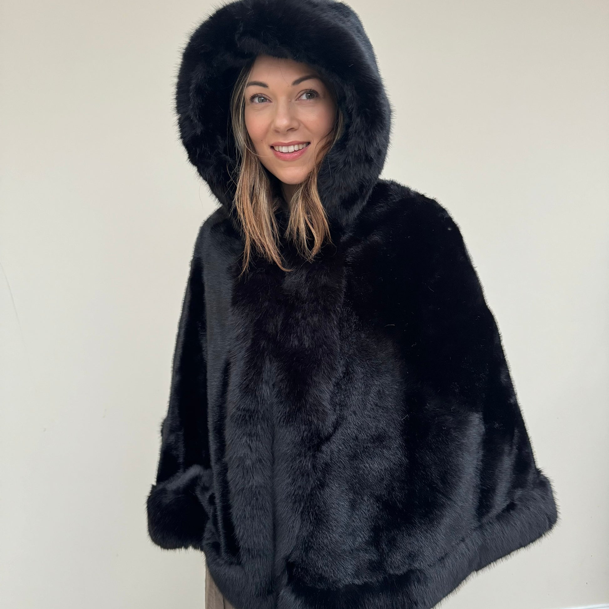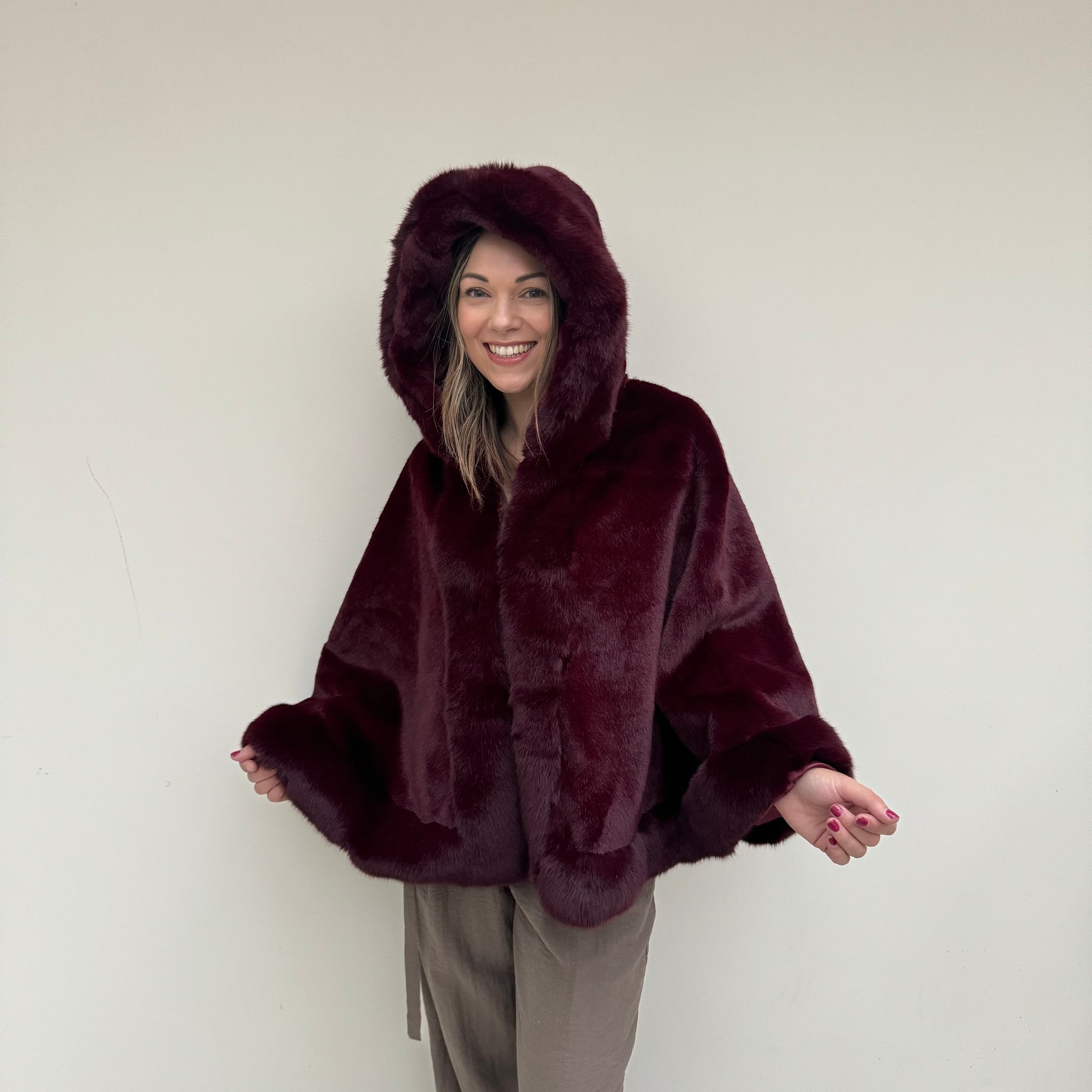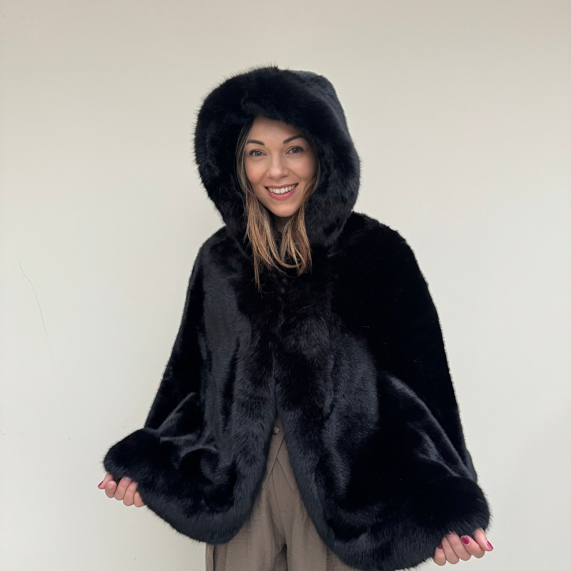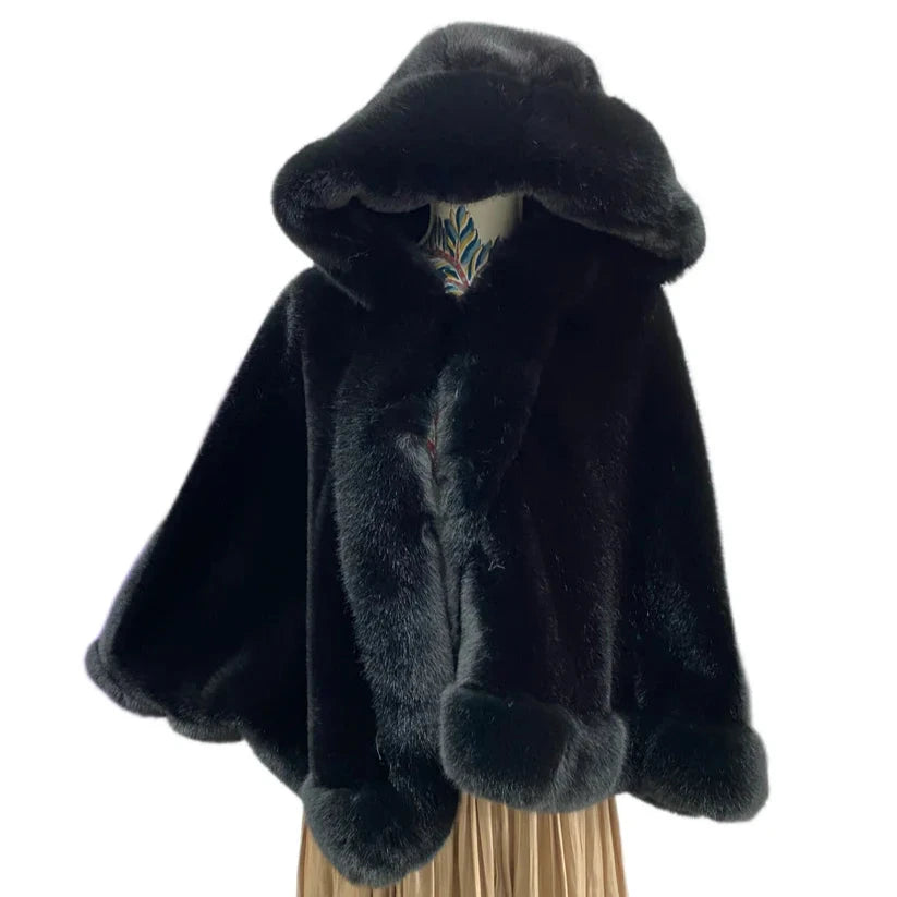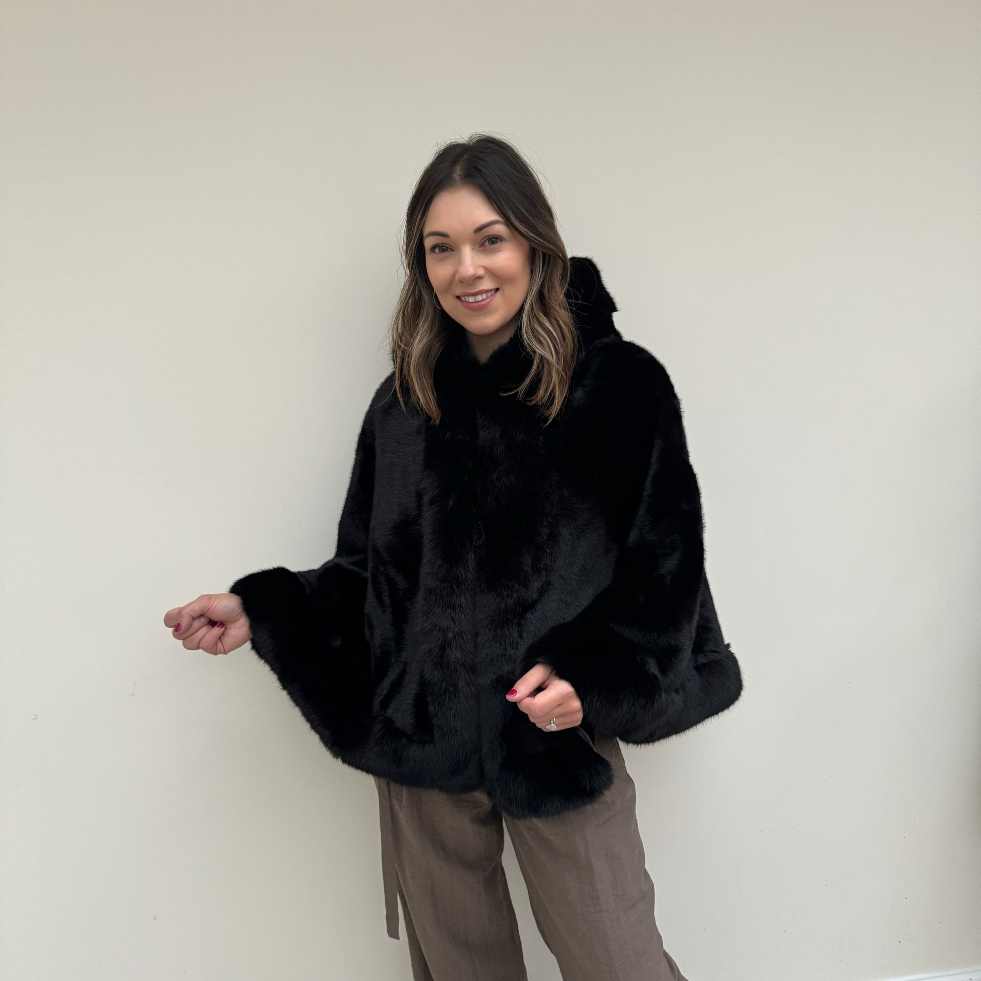 Stay warm and elegant with our Faux Fur Poncho with Hood. This stylish poncho combines luxurious faux fur with a practical hood for added warmth and comfort. The relaxed fit and plush texture make it a perfect layering piece for chilly days, offering both sophistication and cosiness. Ideal for retailers seeking a fashionable outerwear option that exudes timeless winter charm.