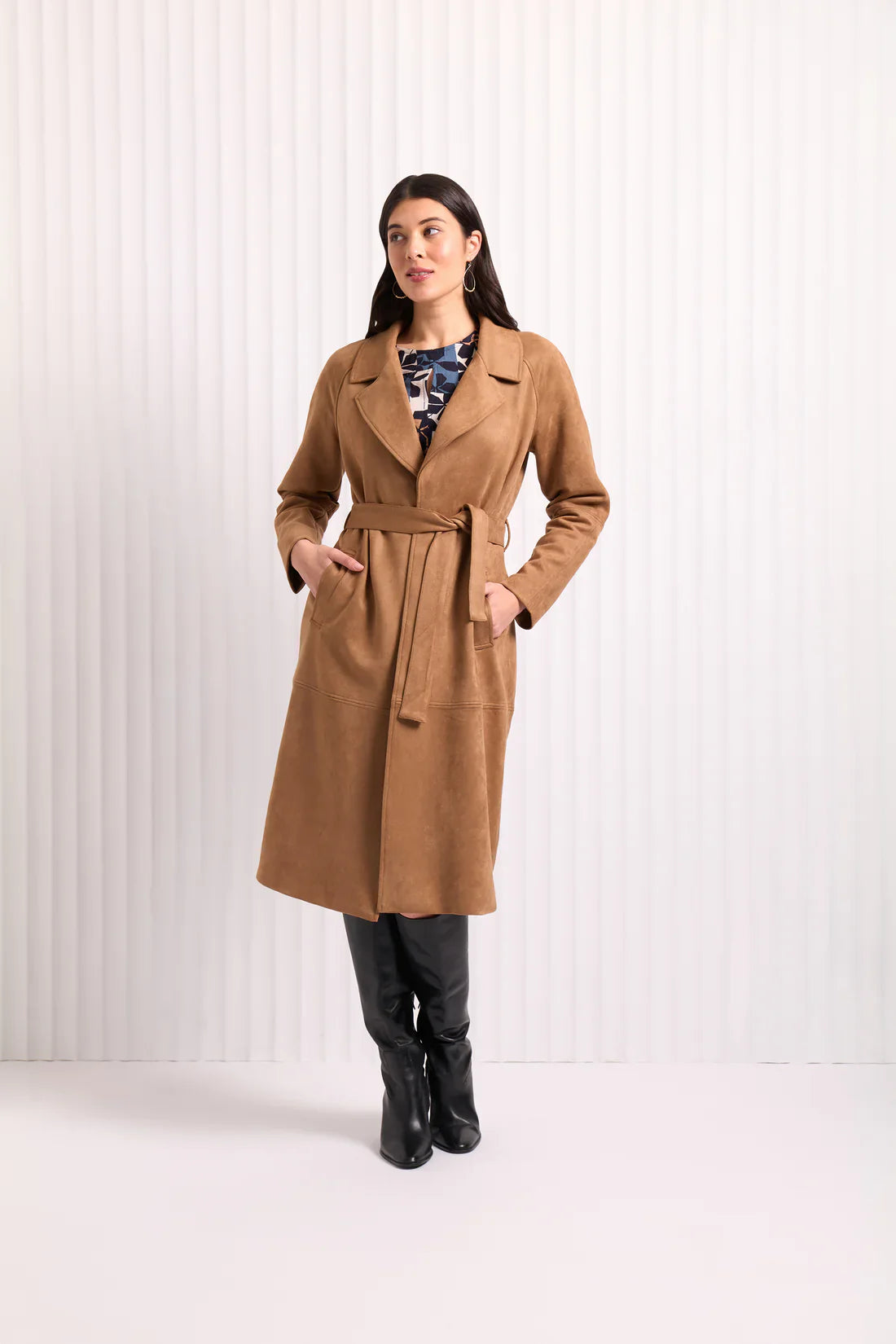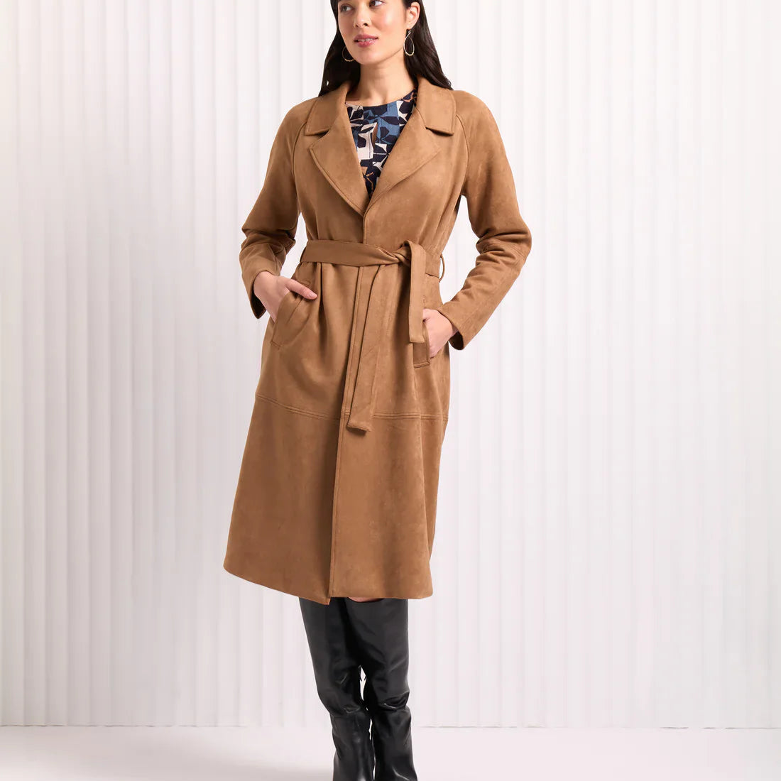 Indulge in luxury with the Faux-Sure Trench. This faux suede coat from the Foil label has a self-belted waist, and a soft handle for a touch of elegance. Embrace your inner style icon and make a statement in this exclusive chalk-coloured coat.