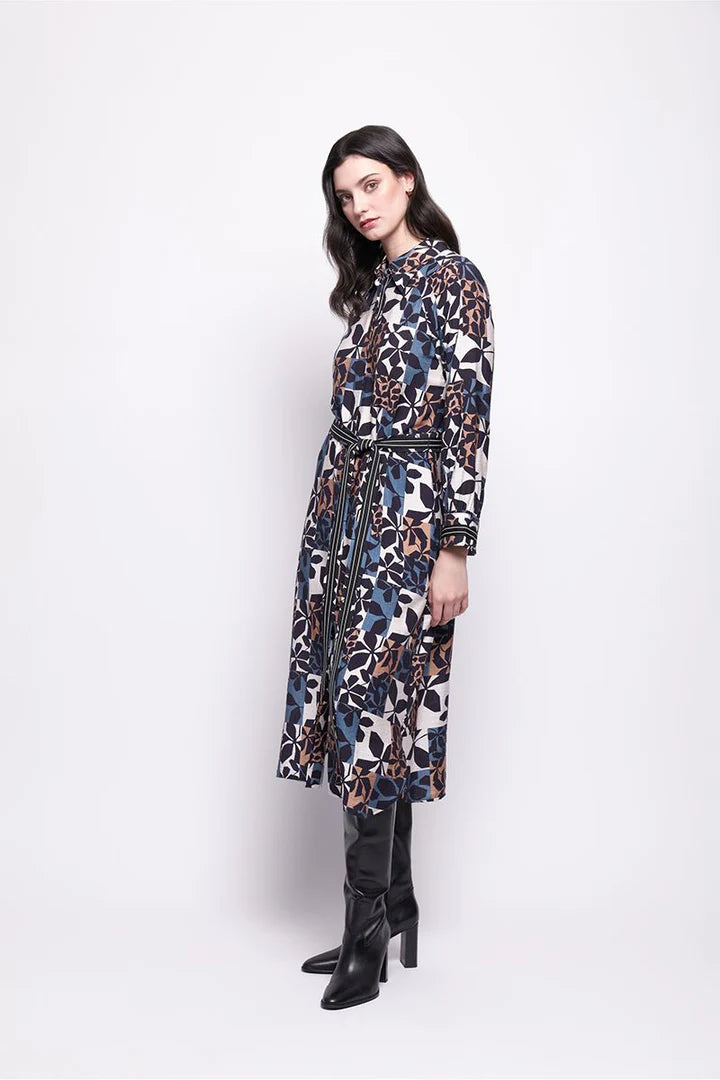 It has a 'V' neck with buttons down the front, a soft collar & button cuffs as well as a self tie belt.