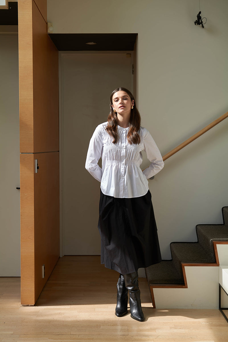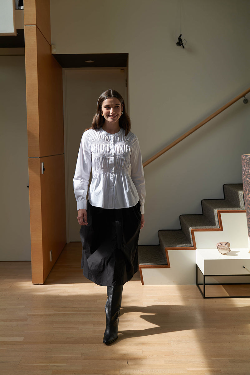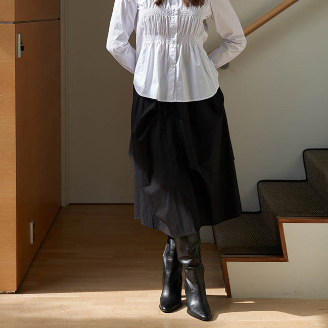 This Foil Stitch Perfect Skirt Black combines beautiful tailoring with a feminine shape for effortless style. Made from soft cotton poplin, its layered fabric adds volume and a refined look. The elastic back waist ensures a comfortable, regular fit, while the stitch detail on the waistline gives it a unique touch. Perfect for standing out with subtle elegance, this skirt pairs easily with casual or dressier tops for versatile wear.