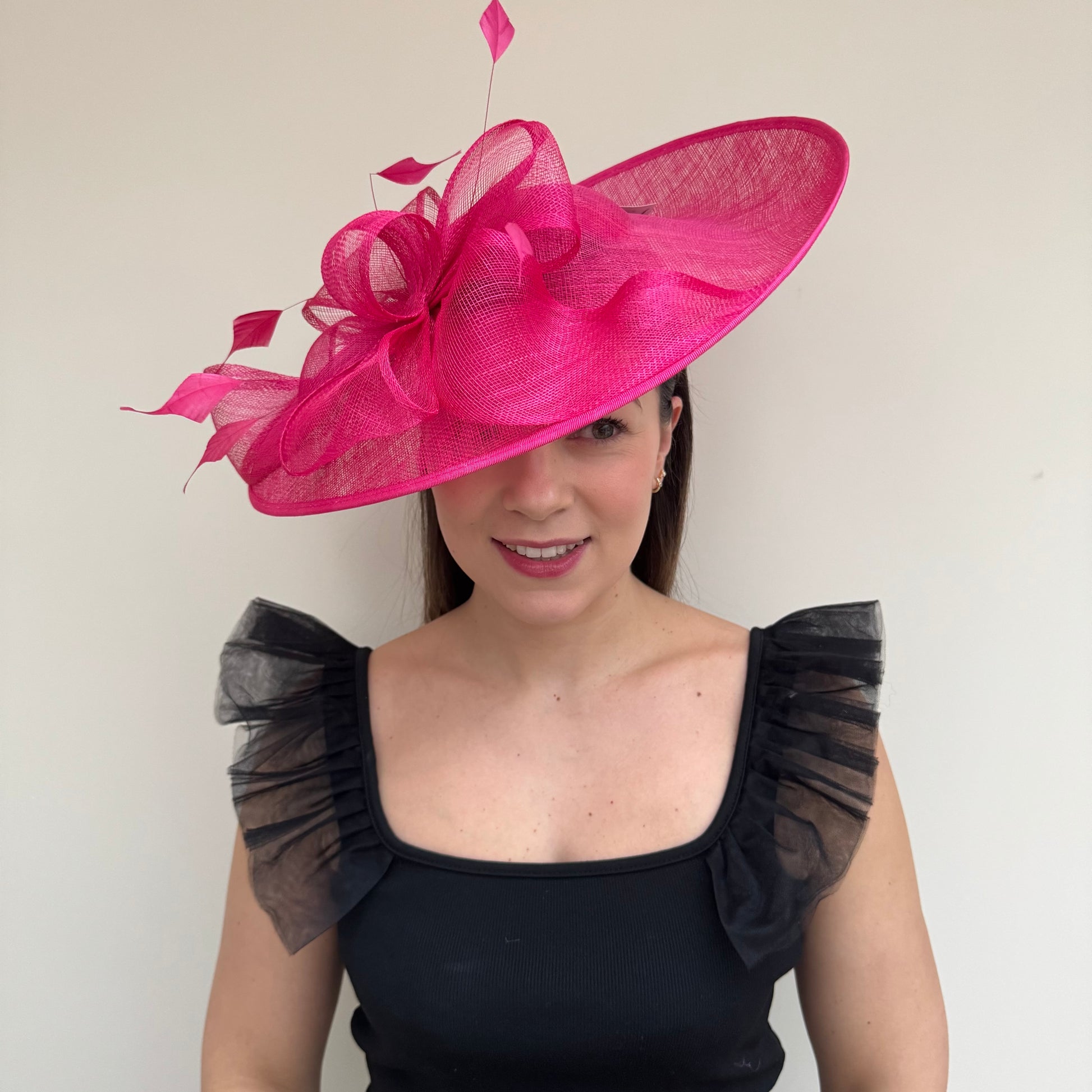 A gorgeous large bow and feathers, adorns the top of this gorgeous hatinator. Available in a range of colours.
