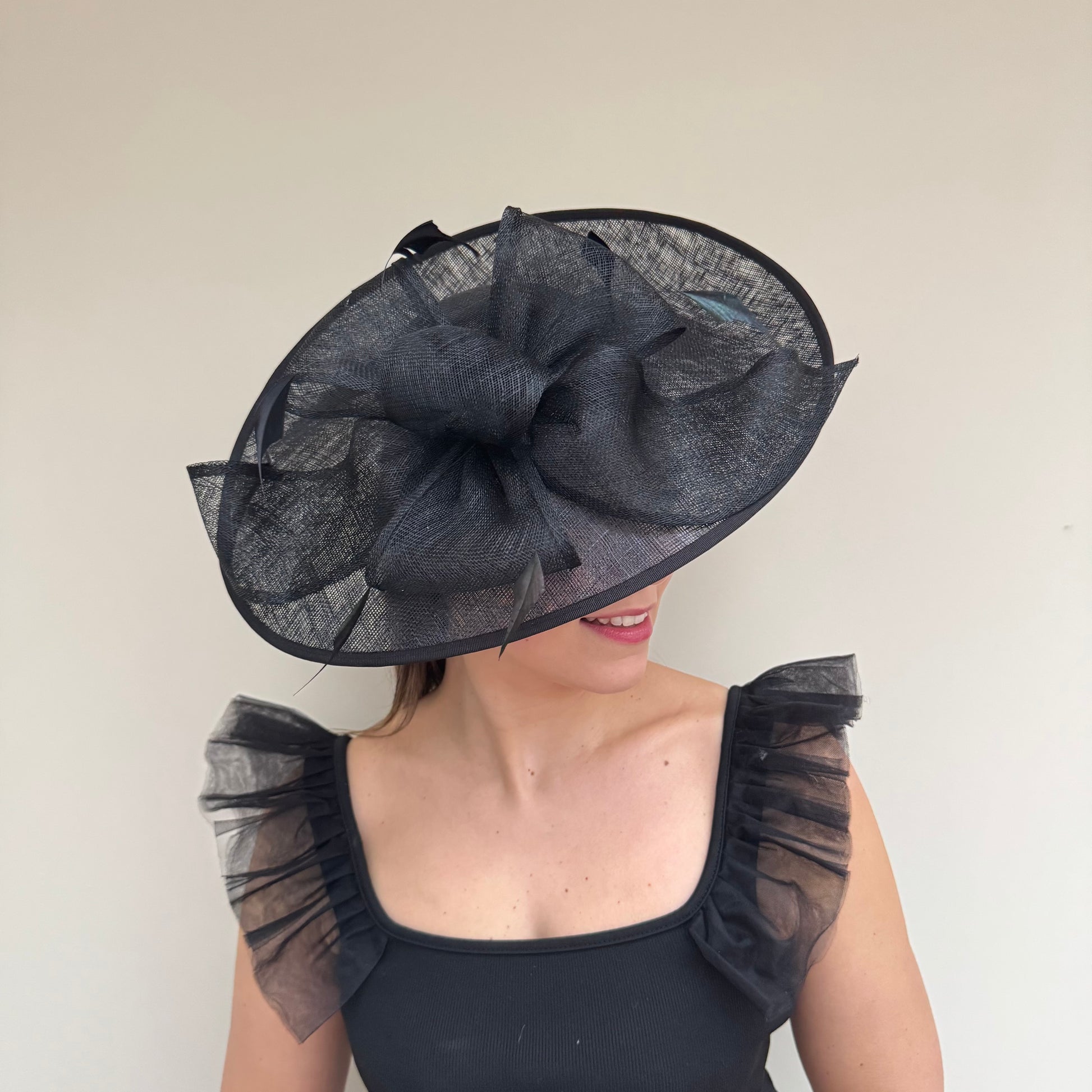 A gorgeous large bow and feathers, adorns the top of this gorgeous hatinator. Available in a range of colours.