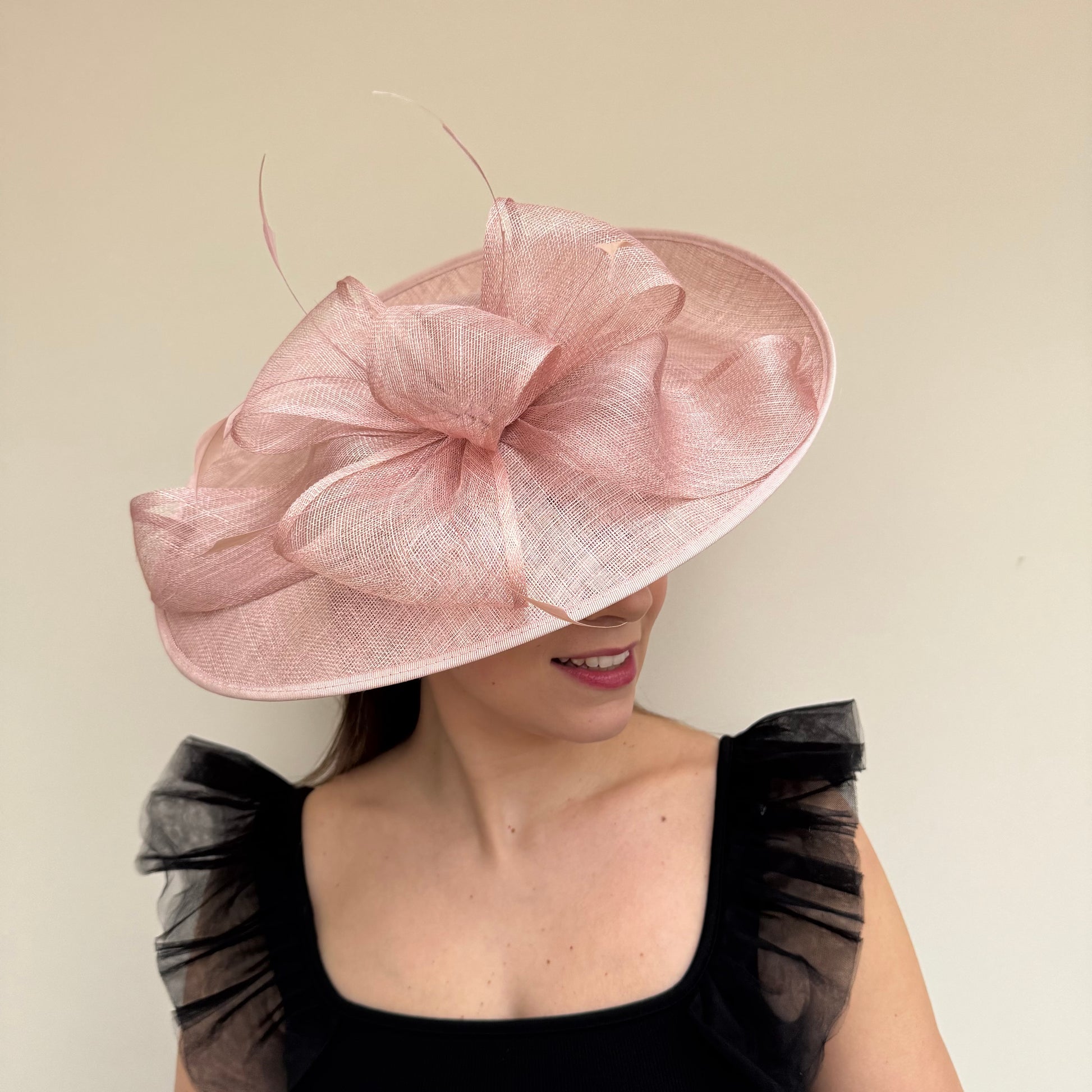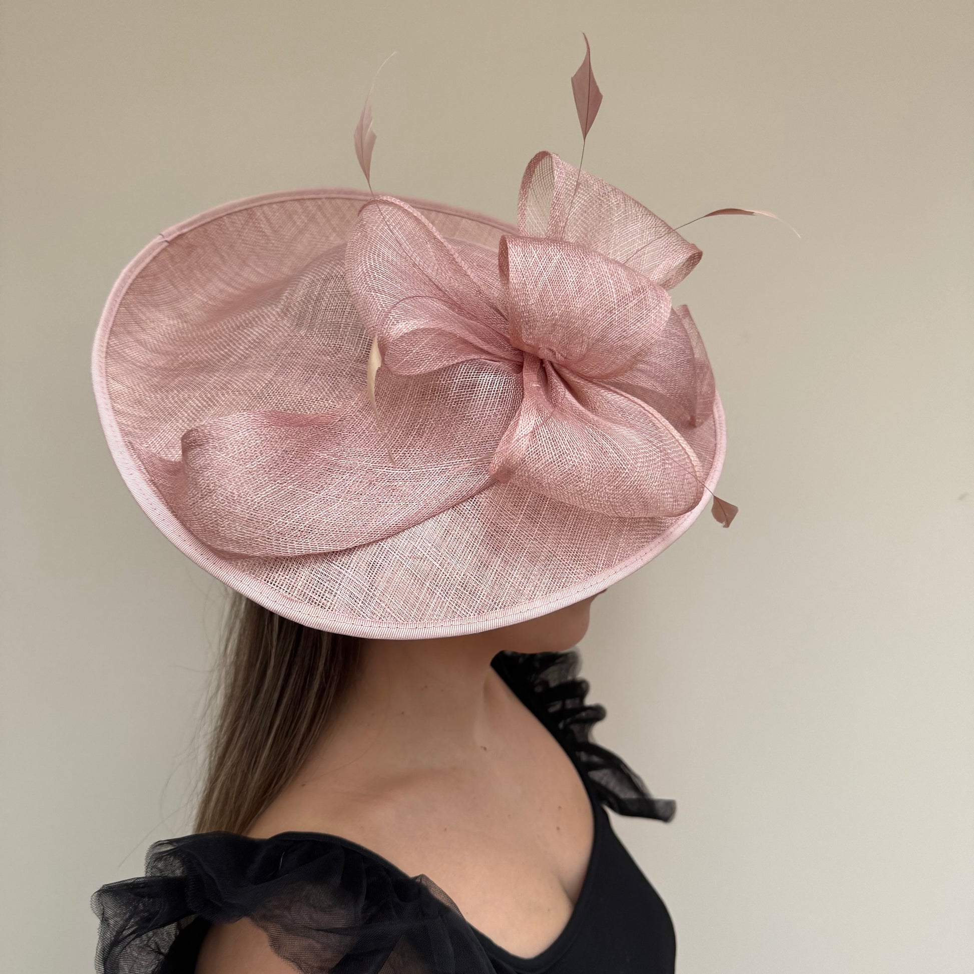 A gorgeous large bow and feathers, adorns the top of this gorgeous hatinator. Available in a range of colours.