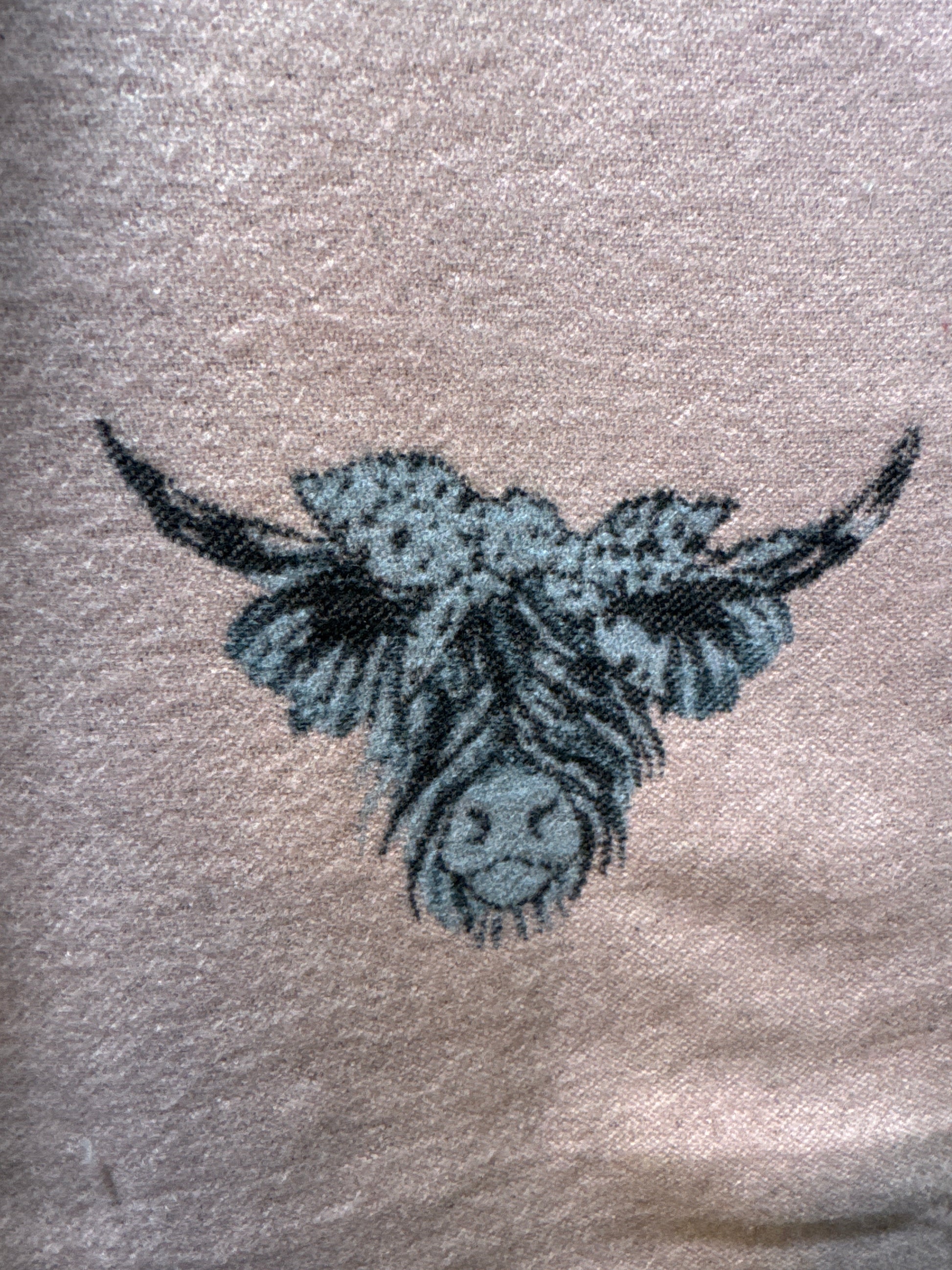 A long, soft tassel scarf with a highland cow print